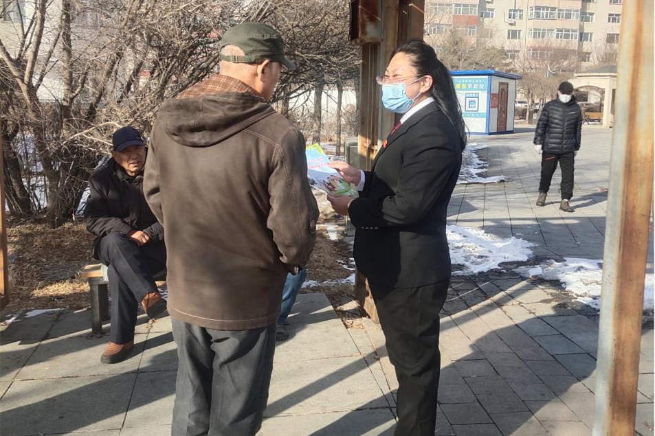 行政庭干警进入到万宝一区给广大群众进行普法宣传活动。活动中,工作人员向辖区群众发放《中华人民共和国家庭教育促进法》等宣传资料,向领取宣传册的群众解答所关心的法律问题,让法律走到群众身边、走进群众心里。