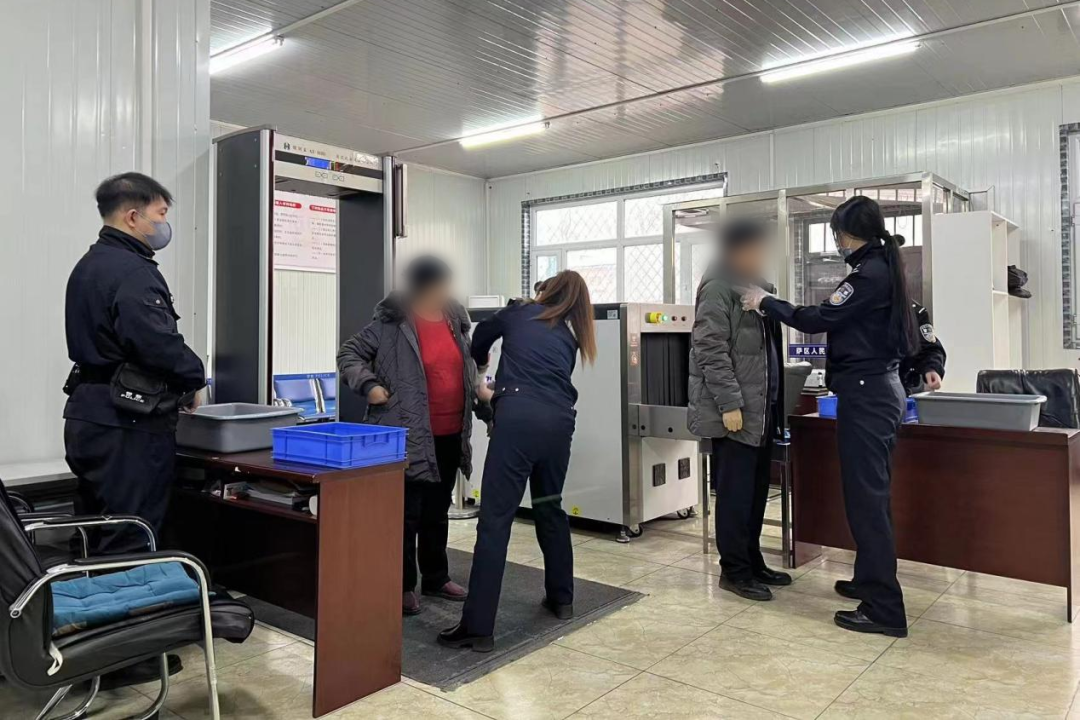 法警队干警对当事人进行安检,仔细核对身份证、寄存物品,守好法院第一关口。