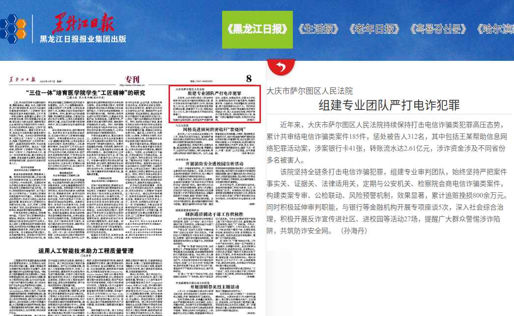 近年来,大庆市萨尔图区人民法院持续保持打击电信诈骗类犯罪高压态势,累计共审结电信诈骗类案件185件,惩处被告人312名,其中包括王某帮助信息网络犯罪活动案,涉案银行卡41张,转账流水达2.61亿元,涉诈资金涉及不同省份多名被害人。