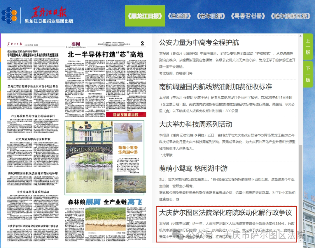 走在前列|《黑龙江日报》:大庆市萨尔图区人民法院深化府院联动化解行政争议 发布时间:2025-06-05 09:15:50
